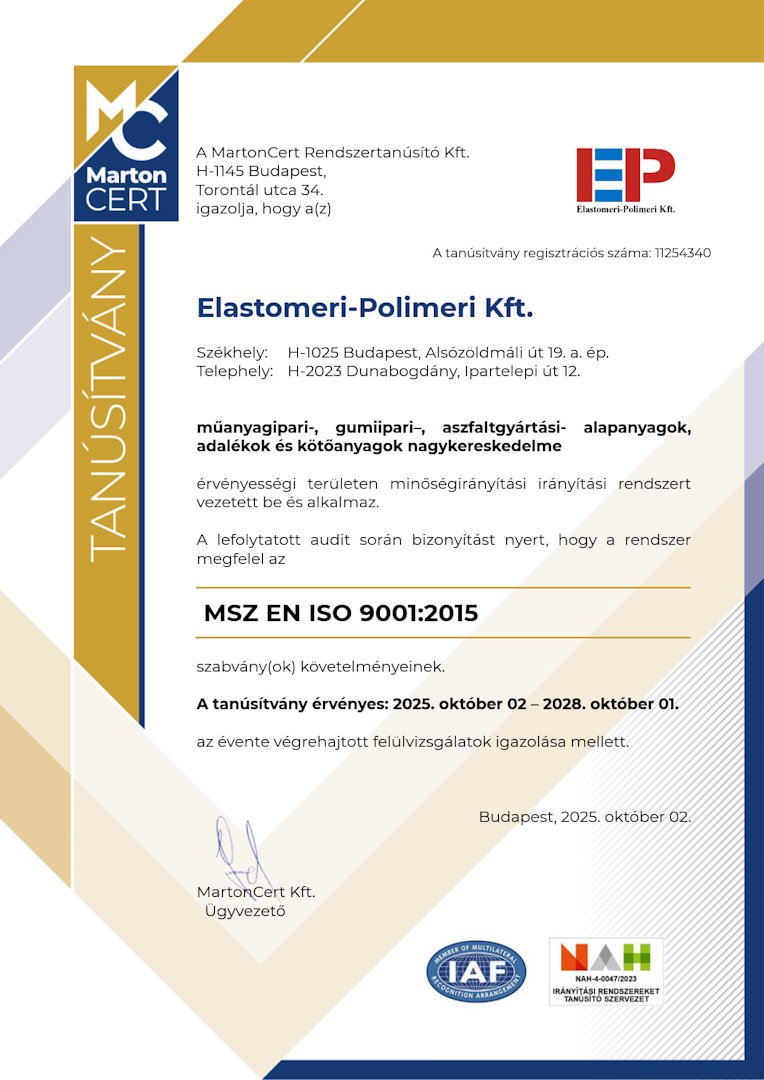 • Cégünk 2002-ben alakult, elsősorban a Versalis (Polimeri-Europa) által gyártott szintetikus kaucsuk (EPDM, NBR, CR, TPR) termékeinek forgalmazására. A cég létezését évtizedes szakmai kapcsolat előzte meg e termékek gyártóival. Törekvésünk, hogy vevőink számára minél teljesebb körű szolgáltatást tudjunk nyújtani, beleértve a logisztikát és a műszaki segítséget. Ennek figyelembevételével bővítjük termékkínálatunkat.